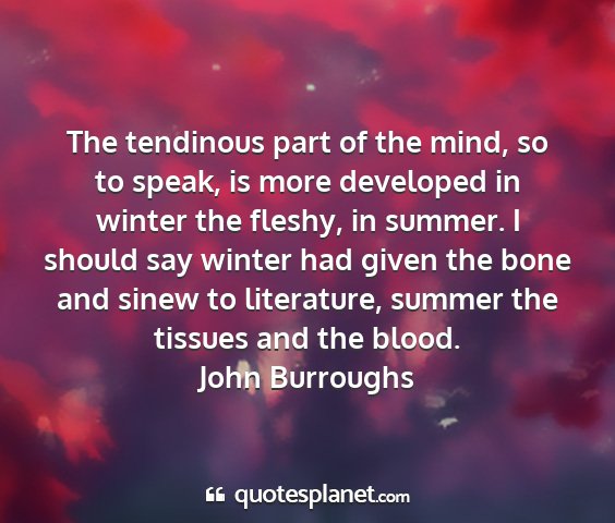 The tendinous part of the mind, so to speak, is more developed in winter the fleshy, in summer. I should say winter had given the bone and sinew to literature, summer the tissues and the blood.John Burroughs