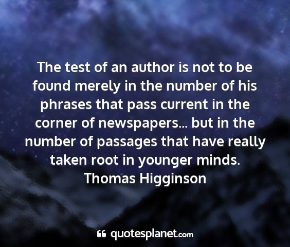 The test of an author is not to be found merely in the number of his phrases that pass current in the corner of newspapers... but in the number of passages that have really taken root in younger minds.Thomas Higginson