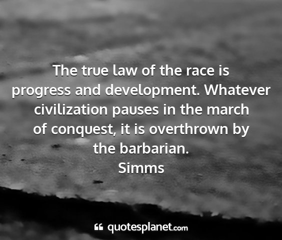 The true law of the race is progress and development. Whatever civilization pauses in the march of conquest, it is overthrown by the barbarian.Simms