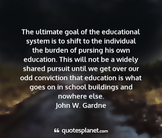 The ultimate goal of the educational system is to shift to the individual the burden of pursing his own education. This will not be a widely shared pursuit until we get over our odd conviction that education is what goes on in school buildings and nowhere else.John W. Gardne
