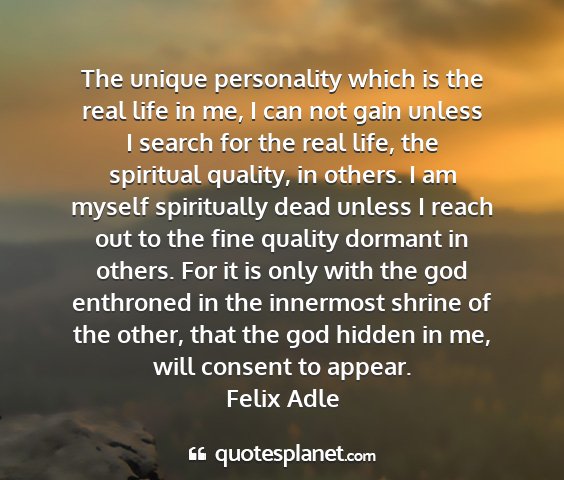 The unique personality which is the real life in me, I can not gain unless I search for the real life, the spiritual quality, in others. I am myself spiritually dead unless I reach out to the fine quality dormant in others. For it is only with the god enthroned in the innermost shrine of the other, that the god hidden in me, will consent to appear.Felix Adle