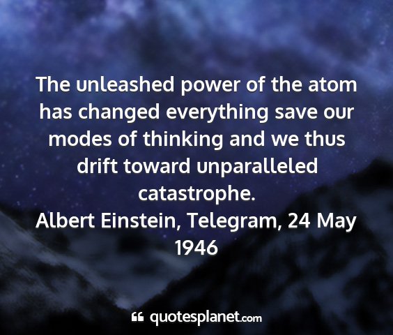 The unleashed power of the atom has changed everything save our modes of thinking and we thus drift toward unparalleled catastrophe.Albert Einstein, Telegram, 24 May 1946