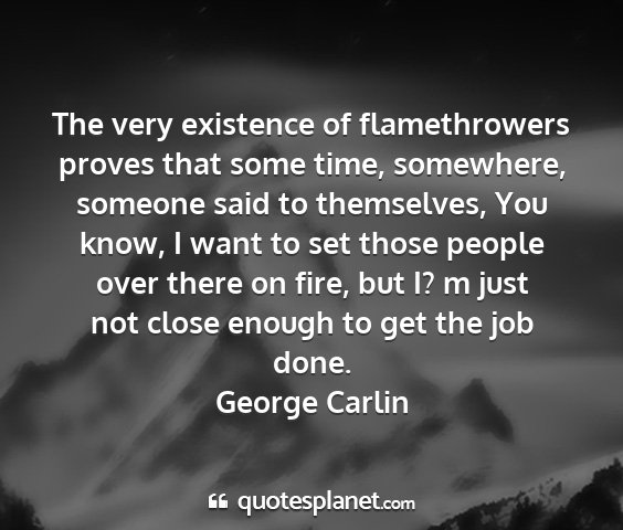 The very existence of flamethrowers proves that some time, somewhere, someone said to themselves, You know, I want to set those people over there on fire, but I? m just not close enough to get the job done.George Carlin