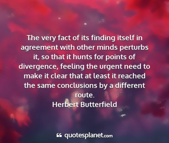The very fact of its finding itself in agreement with other minds perturbs it, so that it hunts for points of divergence, feeling the urgent need to make it clear that at least it reached the same conclusions by a different route.Herbert Butterfield