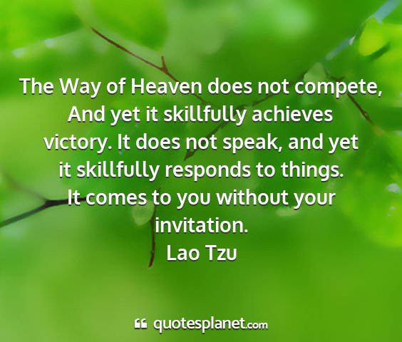 The Way of Heaven does not compete, And yet it skillfully achieves victory. It does not speak, and yet it skillfully responds to things. It comes to you without your invitation.Lao Tzu