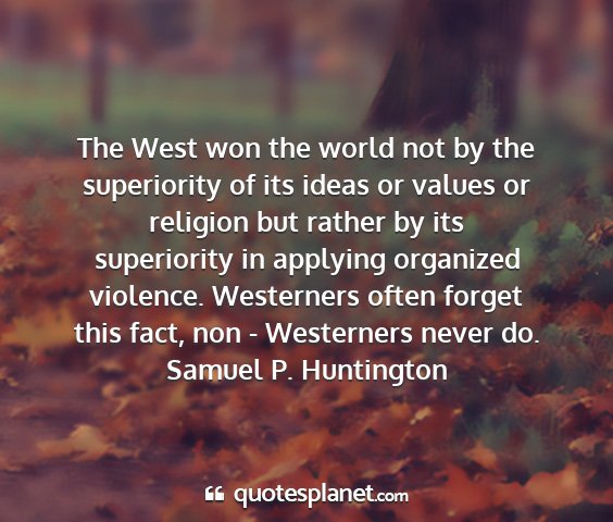 The West won the world not by the superiority of its ideas or values or religion but rather by its superiority in applying organized violence. Westerners often forget this fact, non - Westerners never do.Samuel P. Huntington