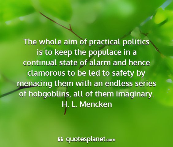 The whole aim of practical politics is to keep the populace in a continual state of alarm and hence clamorous to be led to safety by menacing them with an endless series of hobgoblins, all of them imaginary.H. L. Mencken