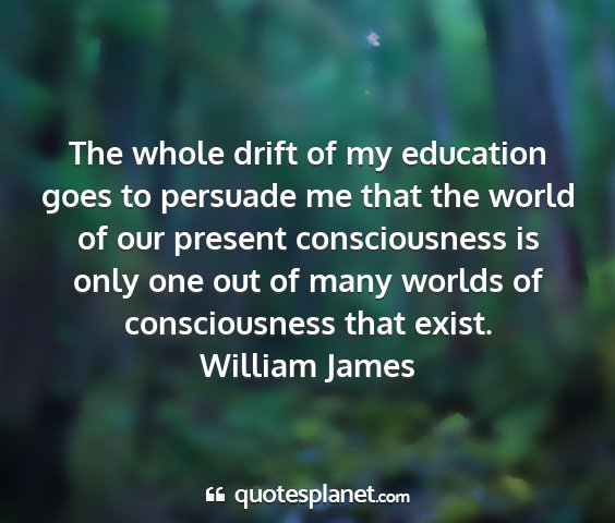 The whole drift of my education goes to persuade me that the world of our present consciousness is only one out of many worlds of consciousness that exist.William James