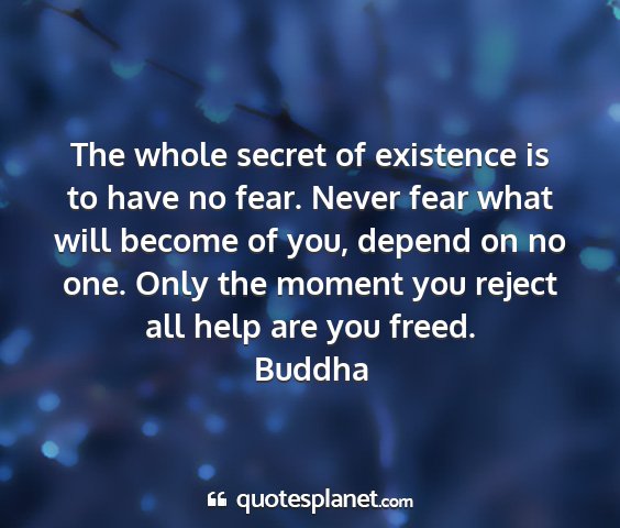 The whole secret of existence is to have no fear. Never fear what will become of you, depend on no one. Only the moment you reject all help are you freed.Buddha