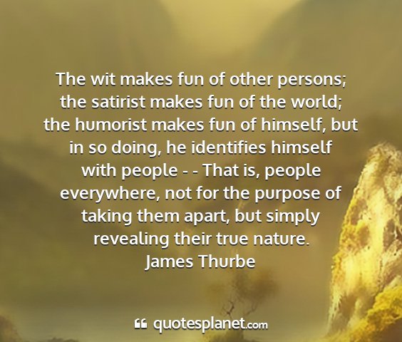 The wit makes fun of other persons; the satirist makes fun of the world; the humorist makes fun of himself, but in so doing, he identifies himself with people - - That is, people everywhere, not for the purpose of taking them apart, but simply revealing their true nature.James Thurbe