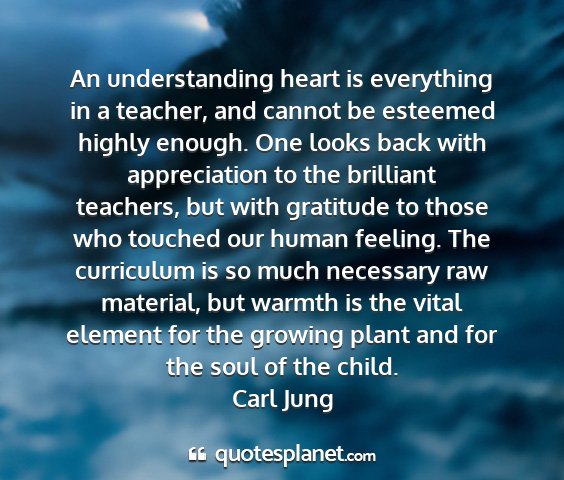 An understanding heart is everything in a teacher, and cannot be esteemed highly enough. One looks back with appreciation to the brilliant teachers, but with gratitude to those who touched our human feeling. The curriculum is so much necessary raw material, but warmth is the vital element for the growing plant and for the soul of the child.Carl Jung