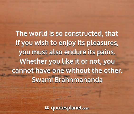 The world is so constructed, that if you wish to enjoy its pleasures, you must also endure its pains. Whether you like it or not, you cannot have one without the other.Swami Brahnmananda