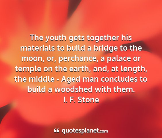 The youth gets together his materials to build a bridge to the moon, or, perchance, a palace or temple on the earth, and, at length, the middle - Aged man concludes to build a woodshed with them.I. F. Stone