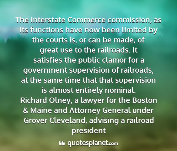 The Interstate Commerce commission, as its functions have now been limited by the courts is, or can be made, of great use to the railroads. It satisfies the public clamor for a government supervision of railroads, at the same time that that supervision is almost entirely nominal.Richard Olney, a lawyer for the Boston & Maine and Attorney General under Grover Cleveland, advising a railroad president