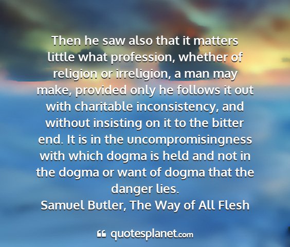 Then he saw also that it matters little what profession, whether of religion or irreligion, a man may make, provided only he follows it out with charitable inconsistency, and without insisting on it to the bitter end. It is in the uncompromisingness with which dogma is held and not in the dogma or want of dogma that the danger lies.Samuel Butler, The Way of All Flesh