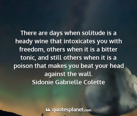 There are days when solitude is a heady wine that intoxicates you with freedom, others when it is a bitter tonic, and still others when it is a poison that makes you beat your head against the wall.Sidonie Gabrielle Colette