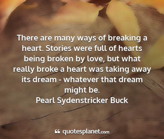 There are many ways of breaking a heart. Stories were full of hearts being broken by love, but what really broke a heart was taking away its dream - whatever that dream might be.Pearl Sydenstricker Buck