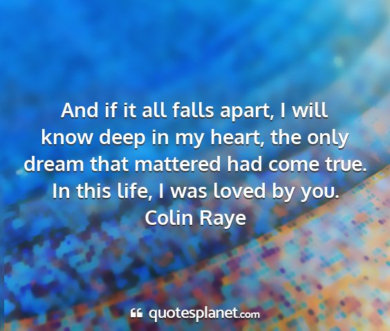 And if it all falls apart, I will know deep in my heart, the only dream that mattered had come true. In this life, I was loved by you.Colin Raye
