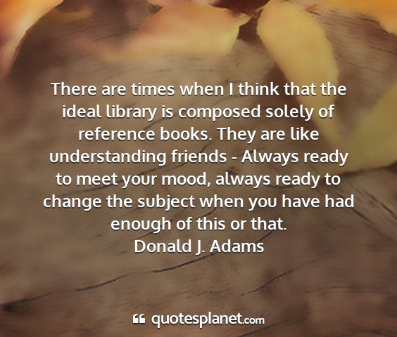 There are times when I think that the ideal library is composed solely of reference books. They are like understanding friends - Always ready to meet your mood, always ready to change the subject when you have had enough of this or that.Donald J. Adams