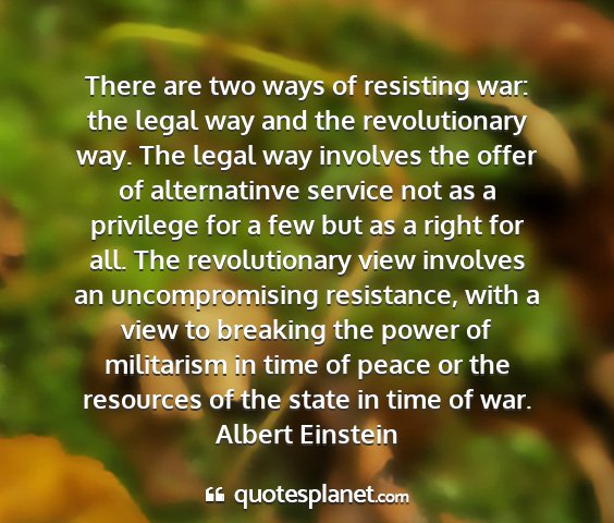 There are two ways of resisting war: the legal way and the revolutionary way. The legal way involves the offer of alternatinve service not as a privilege for a few but as a right for all. The revolutionary view involves an uncompromising resistance, with a view to breaking the power of militarism in time of peace or the resources of the state in time of war.Albert Einstein
