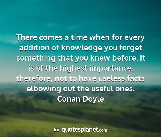 There comes a time when for every addition of knowledge you forget something that you knew before. It is of the highest importance, therefore, not to have useless facts elbowing out the useful ones.Conan Doyle