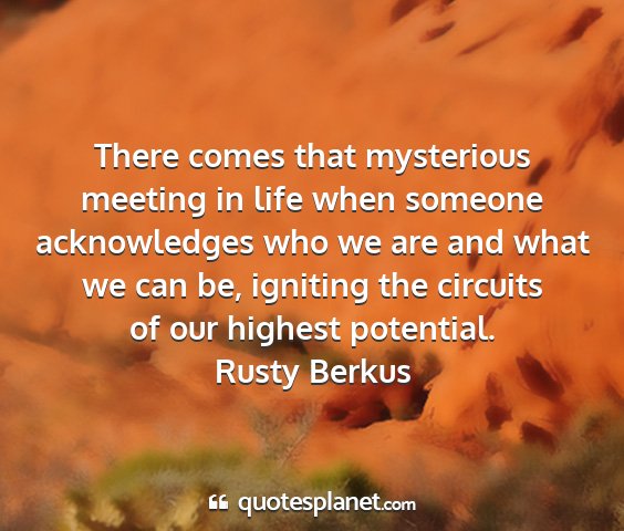 There comes that mysterious meeting in life when someone acknowledges who we are and what we can be, igniting the circuits of our highest potential.Rusty Berkus