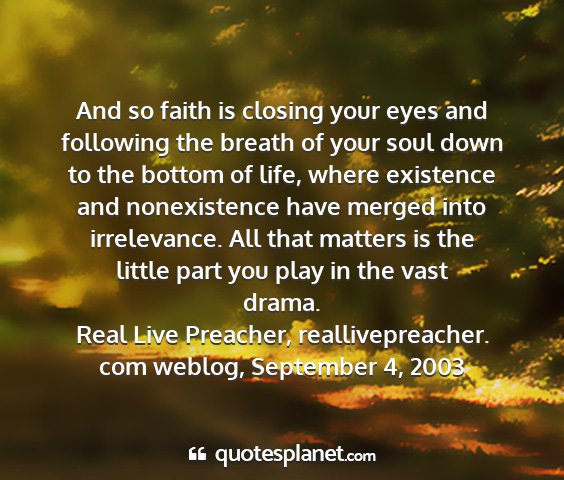 And so faith is closing your eyes and following the breath of your soul down to the bottom of life, where existence and nonexistence have merged into irrelevance. All that matters is the little part you play in the vast drama.Real Live Preacher, reallivepreacher. com weblog, September 4, 2003