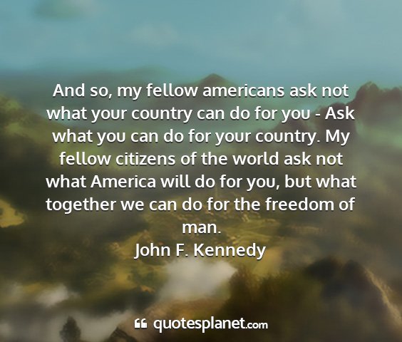 And so, my fellow americans ask not what your country can do for you - Ask what you can do for your country. My fellow citizens of the world ask not what America will do for you, but what together we can do for the freedom of man.John F. Kennedy