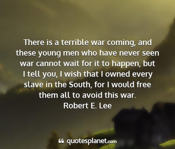 There is a terrible war coming, and these young men who have never seen war cannot wait for it to happen, but I tell you, I wish that I owned every slave in the South, for I would free them all to avoid this war.Robert E. Lee