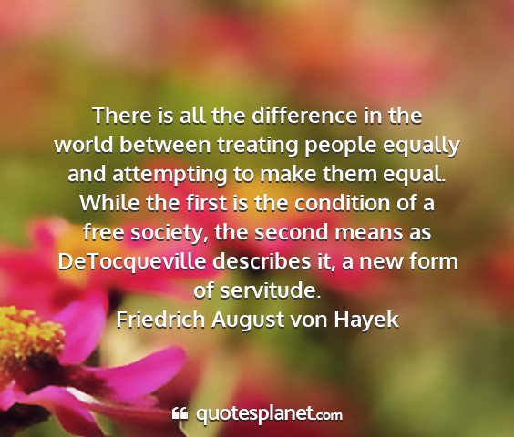 There is all the difference in the world between treating people equally and attempting to make them equal. While the first is the condition of a free society, the second means as DeTocqueville describes it, a new form of servitude.Friedrich August von Hayek