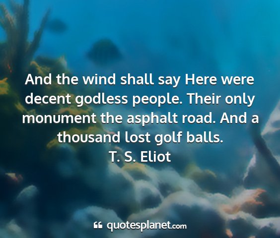 And the wind shall say Here were decent godless people. Their only monument the asphalt road. And a thousand lost golf balls.T. S. Eliot