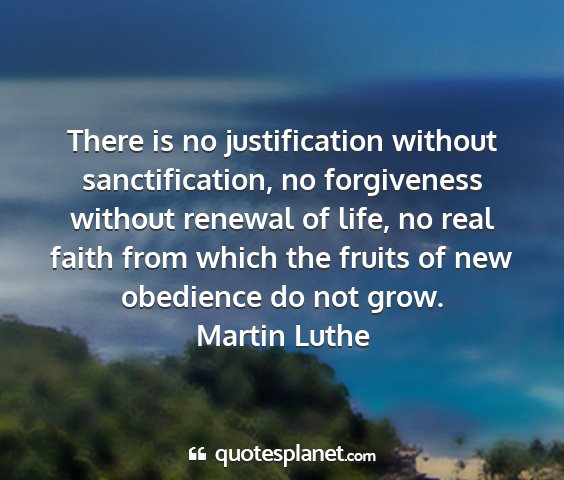 There is no justification without sanctification, no forgiveness without renewal of life, no real faith from which the fruits of new obedience do not grow.Martin Luthe