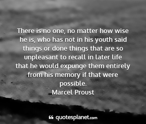 There is no one, no matter how wise he is, who has not in his youth said things or done things that are so unpleasant to recall in later life that he would expunge them entirely from his memory if that were possible.Marcel Proust