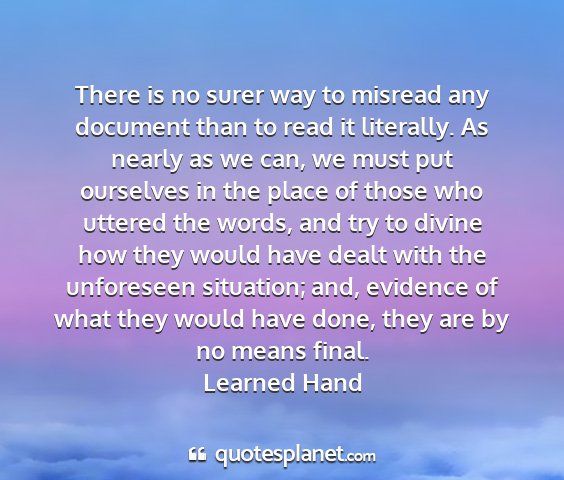 There is no surer way to misread any document than to read it literally. As nearly as we can, we must put ourselves in the place of those who uttered the words, and try to divine how they would have dealt with the unforeseen situation; and, evidence of what they would have done, they are by no means final.Learned Hand