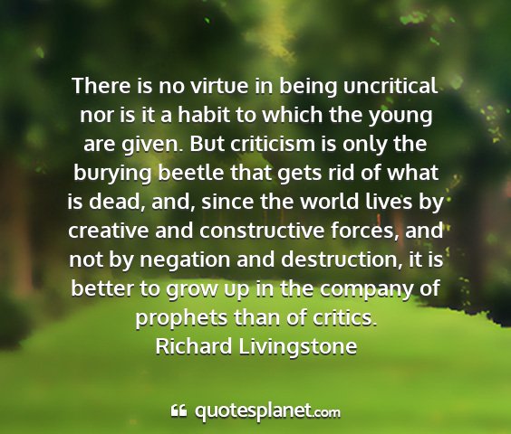 There is no virtue in being uncritical nor is it a habit to which the young are given. But criticism is only the burying beetle that gets rid of what is dead, and, since the world lives by creative and constructive forces, and not by negation and destruction, it is better to grow up in the company of prophets than of critics.Richard Livingstone
