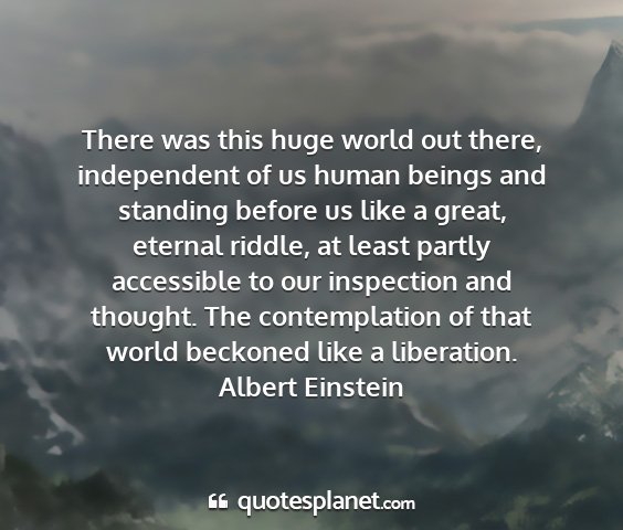 There was this huge world out there, independent of us human beings and standing before us like a great, eternal riddle, at least partly accessible to our inspection and thought. The contemplation of that world beckoned like a liberation.Albert Einstein