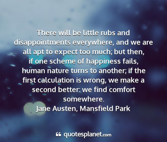 There will be little rubs and disappointments everywhere, and we are all apt to expect too much; but then, if one scheme of happiness fails, human nature turns to another; if the first calculation is wrong, we make a second better: we find comfort somewhere.Jane Austen, Mansfield Park