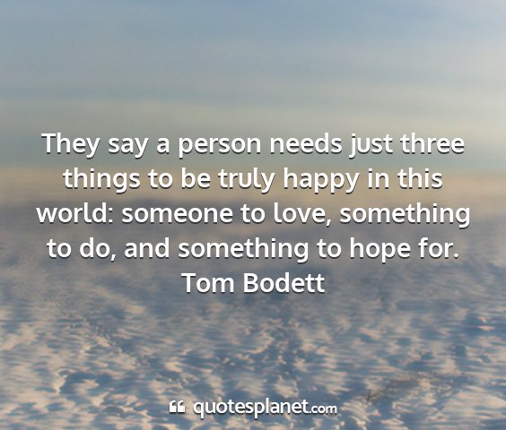 They say a person needs just three things to be truly happy in this world: someone to love, something to do, and something to hope for.Tom Bodett