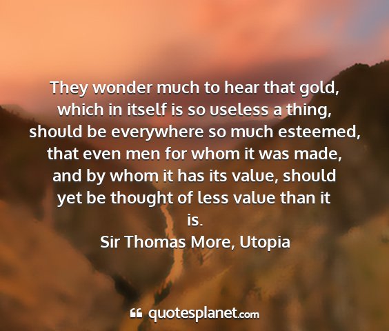 They wonder much to hear that gold, which in itself is so useless a thing, should be everywhere so much esteemed, that even men for whom it was made, and by whom it has its value, should yet be thought of less value than it is.Sir Thomas More, Utopia