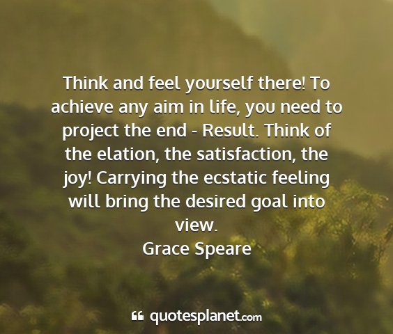 Think and feel yourself there! To achieve any aim in life, you need to project the end - Result. Think of the elation, the satisfaction, the joy! Carrying the ecstatic feeling will bring the desired goal into view.Grace Speare