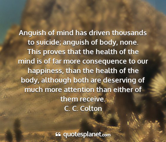 Anguish of mind has driven thousands to suicide; anguish of body, none. This proves that the health of the mind is of far more consequence to our happiness, than the health of the body, although both are deserving of much more attention than either of them receive.C. C. Colton