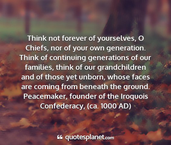Think not forever of yourselves, O Chiefs, nor of your own generation. Think of continuing generations of our families, think of our grandchildren and of those yet unborn, whose faces are coming from beneath the ground.Peacemaker, founder of the Iroquois Confederacy, (ca. 1000 AD)