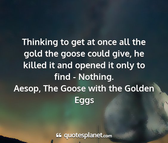 Thinking to get at once all the gold the goose could give, he killed it and opened it only to find - Nothing.Aesop, The Goose with the Golden Eggs