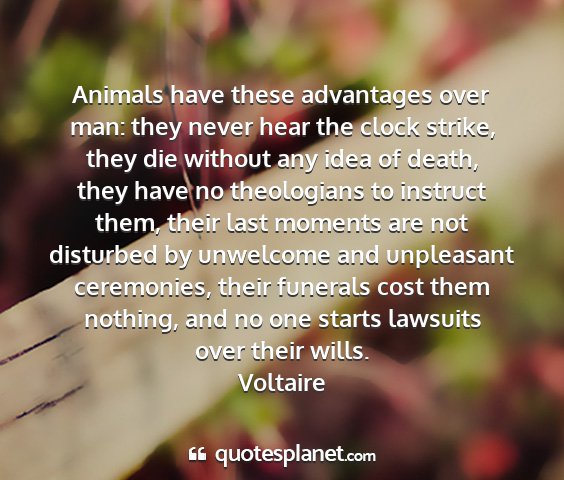 Animals have these advantages over man: they never hear the clock strike, they die without any idea of death, they have no theologians to instruct them, their last moments are not disturbed by unwelcome and unpleasant ceremonies, their funerals cost them nothing, and no one starts lawsuits over their wills.Voltaire