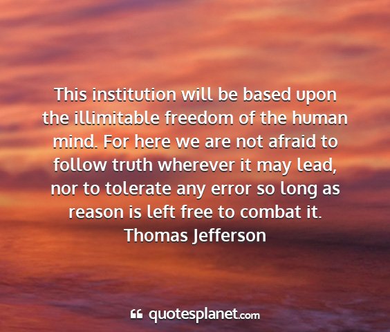 This institution will be based upon the illimitable freedom of the human mind. For here we are not afraid to follow truth wherever it may lead, nor to tolerate any error so long as reason is left free to combat it.Thomas Jefferson