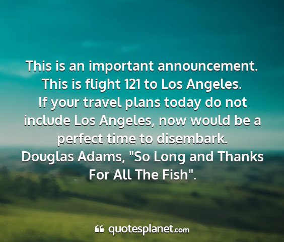 This is an important announcement. This is flight 121 to Los Angeles. If your travel plans today do not include Los Angeles, now would be a perfect time to disembark.Douglas Adams, "So Long and Thanks For All The Fish".