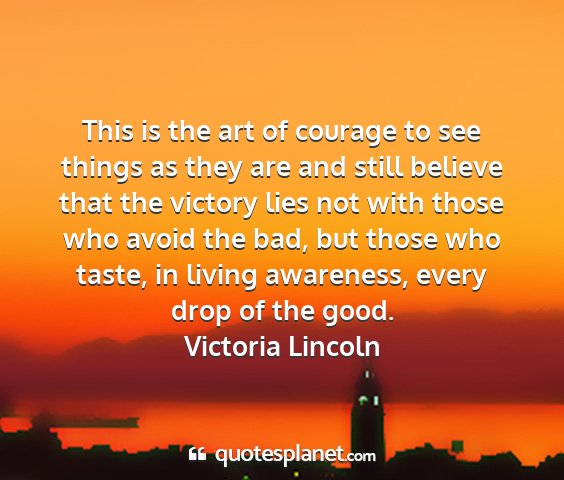 This is the art of courage to see things as they are and still believe that the victory lies not with those who avoid the bad, but those who taste, in living awareness, every drop of the good.Victoria Lincoln
