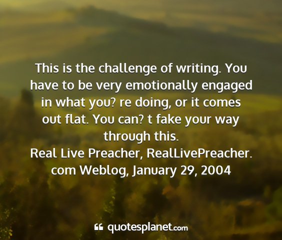 This is the challenge of writing. You have to be very emotionally engaged in what you? re doing, or it comes out flat. You can? t fake your way through this.Real Live Preacher, RealLivePreacher. com Weblog, January 29, 2004