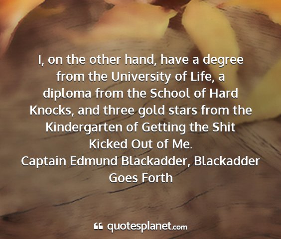 I, on the other hand, have a degree from the University of Life, a diploma from the School of Hard Knocks, and three gold stars from the Kindergarten of Getting the Shit Kicked Out of Me.Captain Edmund Blackadder, Blackadder Goes Forth