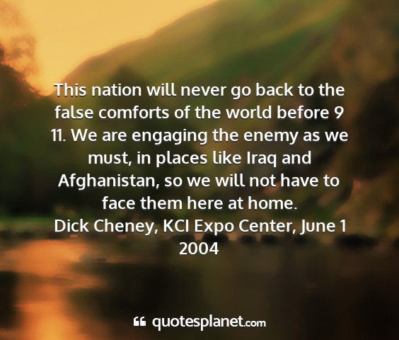 This nation will never go back to the false comforts of the world before 9 11. We are engaging the enemy as we must, in places like Iraq and Afghanistan, so we will not have to face them here at home.Dick Cheney, KCI Expo Center, June 1 2004